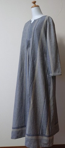 | ノースリーブのワンピース。 裾フレアー、たっぷりです。共布ひもで結んだり、結ばなかったり。 | フレンチスリーブ、胸元タック。 | |||||